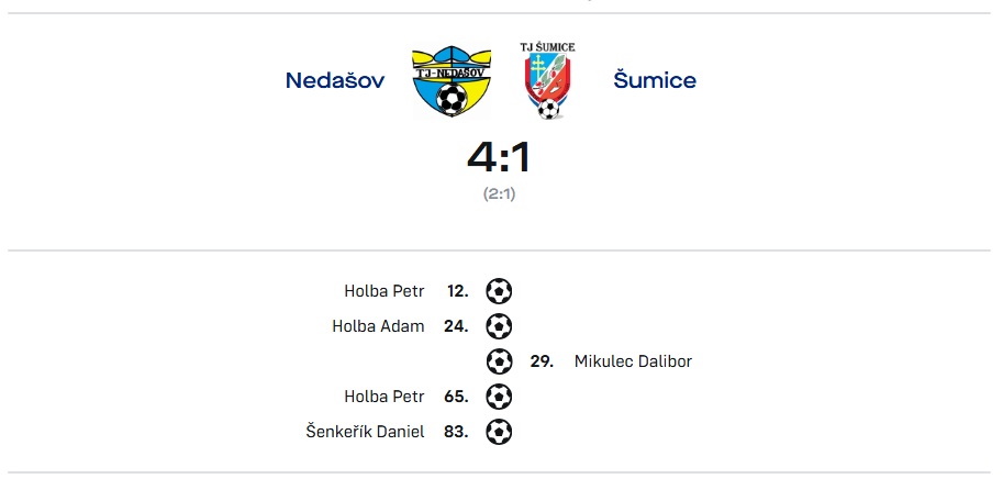 Do utkání jsme vstoupili velmi špatně špatně, přitom jsme věděli, o jak důležitý zápas se jedná. Z naší strany to ale bylo tragické. Všude jsme byli pozdě, prohrávali osobní souboje. Někteří hráči bránili horším způsobem než v žácích. I proto jsme brzy prohrávali 0:2. Pak jsme ale dali balon na zem a najednou zjistili, že se s Nedašovem dá normálně hrát. Po pěkné akci jsme Mikulcem snížili na 2:1. Dobře jsme začali i druhou půli, soupeře jsme v poli přehrávali. Vytvořili jsme si nějaké šance, nastřelili tyčku. Jednou domácí vykopávali míč z brankové čáry. Pořád nám chybí větší tlak do branky. Duel rozhodlo chyba našeho středního záložníka, který vyslal domácího útočníka do brejk a bylo to 3:1. Sestavu jsme prostřídali, protože někteří kluci toho měli plné zuby. Nedašov pak po jedné střele zvýšil na konečných 4:1 Doplácíme na naše hloupé chyby, kterými ztrácíme nejen takto důležité zápasy. Ještě musím zmínit chování domácího Holby (číslo 7), který po faulu našeho Kelíška na soupeře řval přes celý areál, ať mu jednu napálí a podobně. Takovéto chování se mi vůbec nelíbí a do fotbalu nepatří. Pokud se chce rvát, ať změní sport. My jsme do Nedašova jeli hrát fotbal.